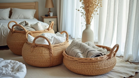 Cozy bedroom design with wicker baskets and natural decor elements. That the image is generated using AI.