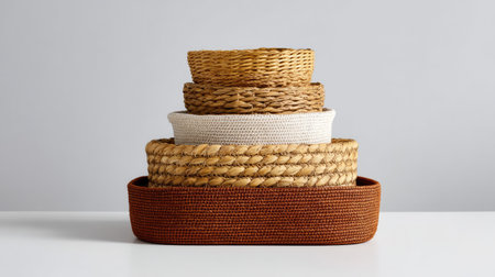 A visually pleasing arrangement of stacked woven baskets in various natural tones, perfect for enhancing home organization and decor in modern interiors.