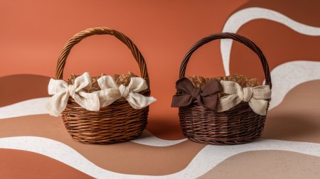 Discover the beauty of these two wicker baskets adorned with charming bows, perfect for decoration or storage, set against a warm, abstract background.
