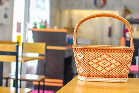 Asian style Wicker bamboo rattan basket with wooden handle hanging on bamboo stick in farmer house