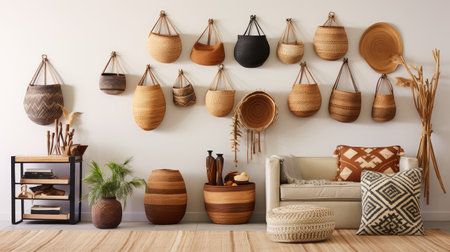 Stylish home decor with woven baskets and dried flowers on a minimalist background, creating a warm and inviting atmosphere for interior design inspiration