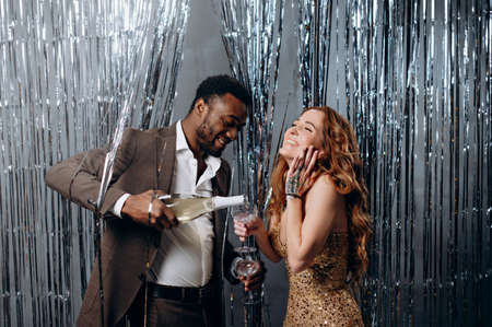 Interracial couple in love celebrating. African man and Caucasian woman having fun and drinking champagne.