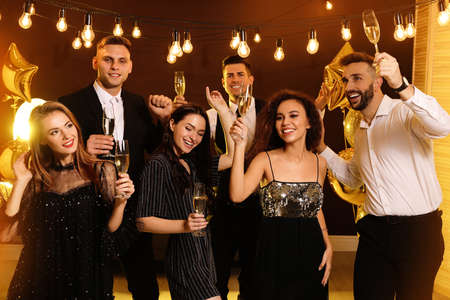 Happy friends with glasses of sparkling wine celebrating New Year indoors