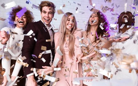 A group of fun young beautiful multinational people throwing confetti at a party. Celebration of 2020