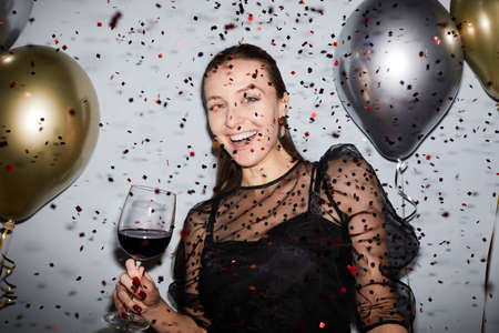 Waist up portrait of carefree young woman partying with confetti falling, shot with flash