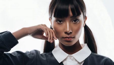 A captivating portrait of a young woman with a direct gaze, featuring a classic white collared shirt and stylish pigtails against a bright backdrop.