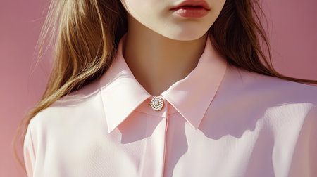 This artistic portrait showcases a young woman in a soft pink blouse, highlighting elegant details against a soothing pastel backdrop, evoking beauty and style.