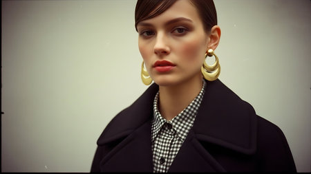 Portrait of beautiful young woman in coat and hat with earrings.