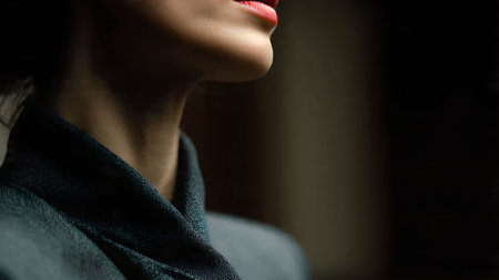 Close-up of a woman with red lipstick in a dark, sophisticated setting. Focus on beauty and elegance.