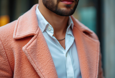 Close-up of a young bearded man in a pink coat on the street