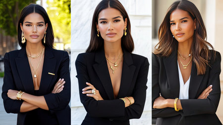 A confident woman in a tailored black suit with radiant gold jewelry poses elegantly in an urban setting, showcasing style and sophistication.