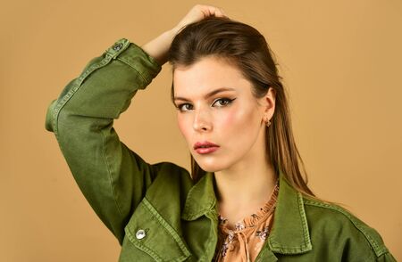 Hairstyle and makeup. Woman confident face with makeup. Elegant makeup concept. Glamorous lady close up. Fashion. Girl beautiful makeup. Beauty salon. Adorable fashionable girl. Natural beauty