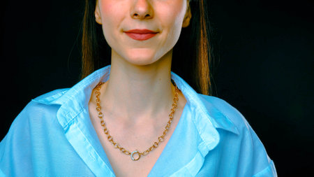 Beautiful woman with a long hair and sensual lips, showing her neck with a choker jewelry on it. Naked flawless skin (collarbones), soft day light, neutral gray background. Square picture