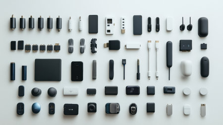 A clean white background displays assorted small tech devices like USBs, earphones, and chargers in an organized layout.