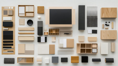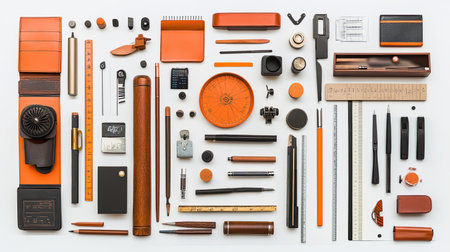 This image showcases a meticulously arranged collection of various small objects and components on a sleek white background, perfect for design inspiration.