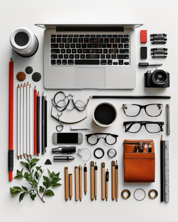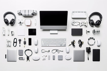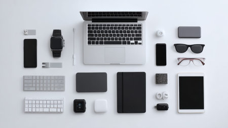 Modern tech items laid out on clean digital background, top view for creative work setting.
