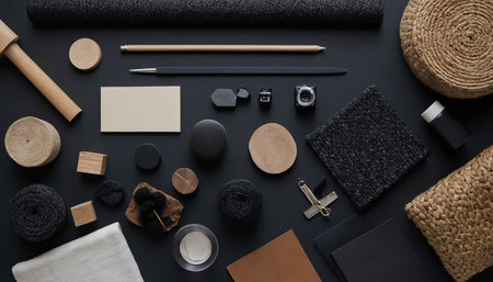 A sleek collection of modern office supplies arranged on a dark background, showcasing creativity and organization in a stylish and minimalistic workspace.