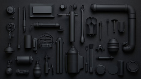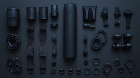 A captivating flat lay of industrial components showcases the beauty of design with an elegant arrangement of various pieces on a dark background.