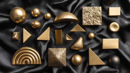 A stunning layout of golden geometric shapes on a sleek black satin background, showcasing various forms and textures, perfect for design inspiration and decor themes.