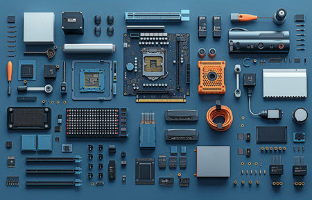 A meticulous arrangement of diverse electronic components showcases the intricate world of technology. Various circuit boards, microchips, and hardware items form a visually appealing layout.