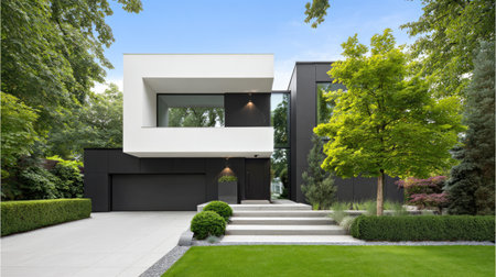 A contemporary residential building showcases a modern architectural design with a minimalist aesthetic. The house features a sleek black and white facade with large windows. Surrounding the structure is a well-manicured green landscape, creating a harmonious blend of nature and modern design. This image could be suitable for real estate, design, or architectural publications.