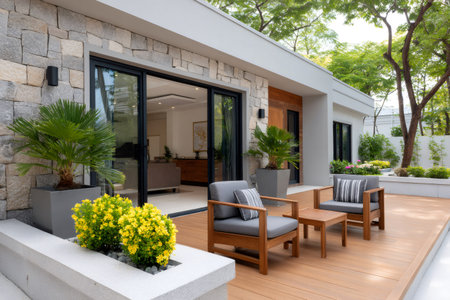 Beautiful backyard terrace full of furniture and decorative plants