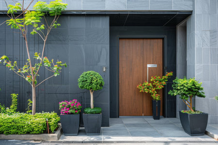 Modern black front door with beautiful green plants on facade of stylish contemporary building