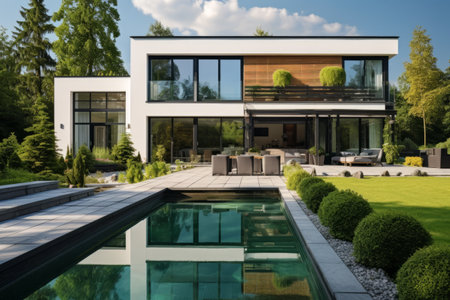 The modern individual residential house is surrounded by a well-groomed beautiful lawn