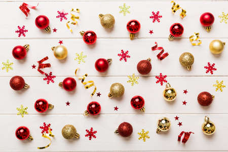 christmas flat lay. red and gold christmas ornaments on white wooden background top view. seasonal greetings card. happy holidays. blurred defocused image