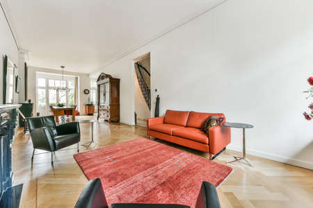 Interior of a modern living room with orange sofa and coffee table