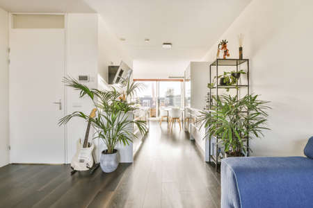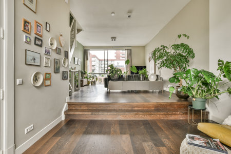 Amsterdam, Netherlands - 10 April, 2021: a living room with wood flooring and plants on the wall in the center of the room is an entry way