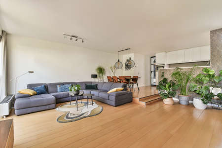 Interior of contemporary living room with comfortable sofa and wooden table in flat