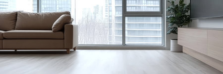 A spacious living room features a light-colored sofa and a low wooden cabinet. Large windows provide a view of an urban skyline, allowing ample natural light to fill the space.