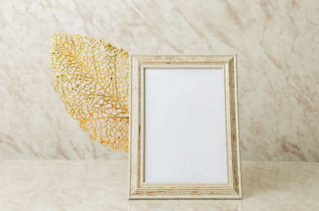 Golden photo frame on marble, flatlay - modern feminine, artwork mock up, luxury design concept. Decorate with chic and style