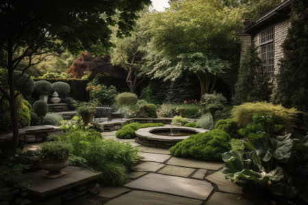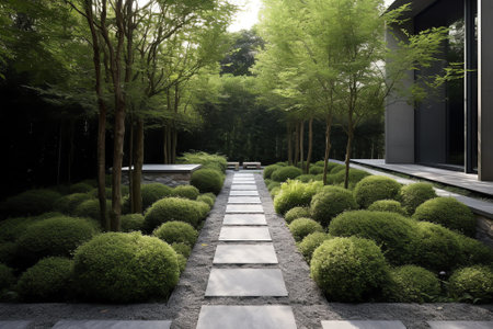 A minimalist garden with a mix of lush greenery and sculptural accents. AI generated illustration