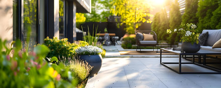 Stylish Outdoor Patio Design with Modern Furniture and Potted Plants. Concept Outdoor Patio, Modern Furniture, Potted Plants, Stylish Design, Home Decor