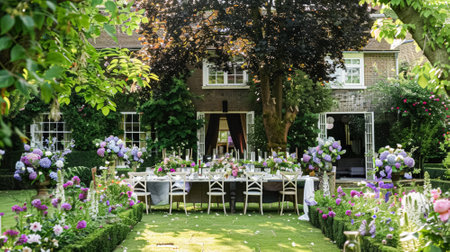 al fresco dining table surrounded by lush greenery and blooming flowers, created with generative ai