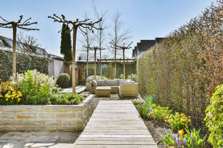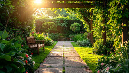 Garden with walkway and bench in the morning light. Beautiful summer landscape.