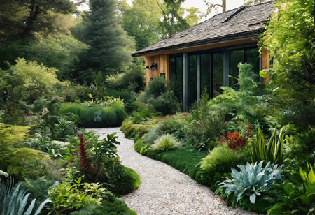 Garden-jungle-style behind the house with a mix of plant species and natural walkways, generative ai