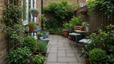 A charming outdoor patio with comfortable seating, earth-tone cushions, and lush green plants