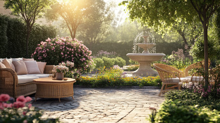 A sunlit garden patio with wicker furniture, blooming plants, and a stone fountain in the background, creating a charming, relaxed outdoor setting.