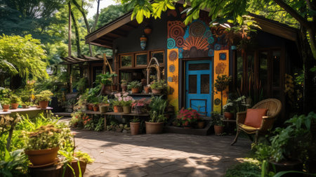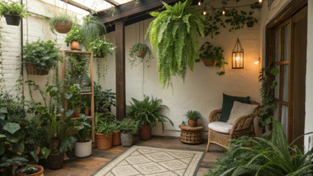 potted plants and hanging lanterns decorate serene patio garden, created with generative ai