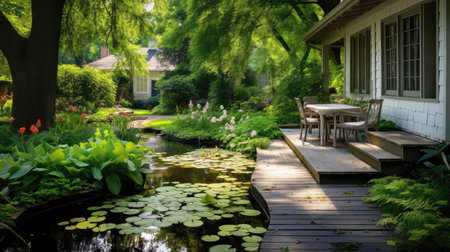 Discover a tranquil garden scene featuring a reflective water feature surrounded by lush greenery and vibrant flowers, offering a peaceful escape.