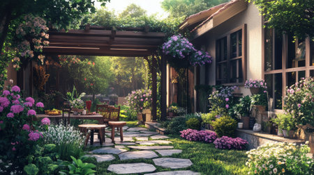 Generative AI, Beautiful summer private garden with many flowers and plants, nature landscape, english countryside cottage style