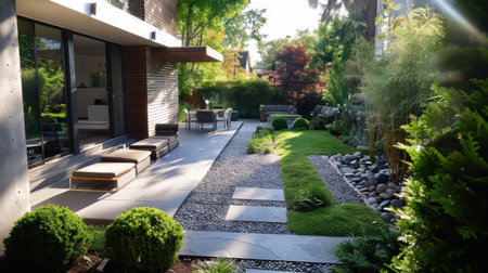 A large backyard with a patio area and a garden. The patio area has a few lounge chairs and a dining table. The garden has a stone pathway and a rock wall. Scene is peaceful and relaxing