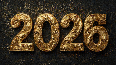 A stunning golden number 2026 design featuring intricate floral patterns on a dark background, ideal for festive occasions, invitations, and celebratory themes.