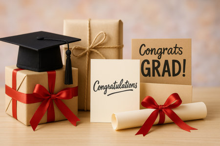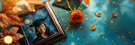 A flatlay of a graduation cap, diploma, flowers, and a ribbon on a gray background. It symbolizes achievement, success, and new beginnings.