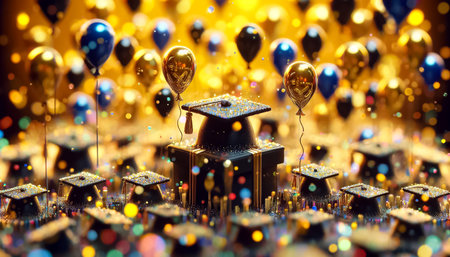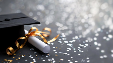 A black graduation cap, a rolled up diploma, and a gold ribbon on a black background with silver glitter. The image captures the joy and accomplishment of graduation day.