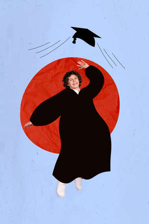 Vertical collage portrait of excited boy wear mantle hand throwing mortarboard up isolated on drawing background