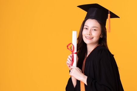 Happy Graduate asian woman in cap and gowm holding Certificated or diploma on yellow background,Summer Graduation Concept